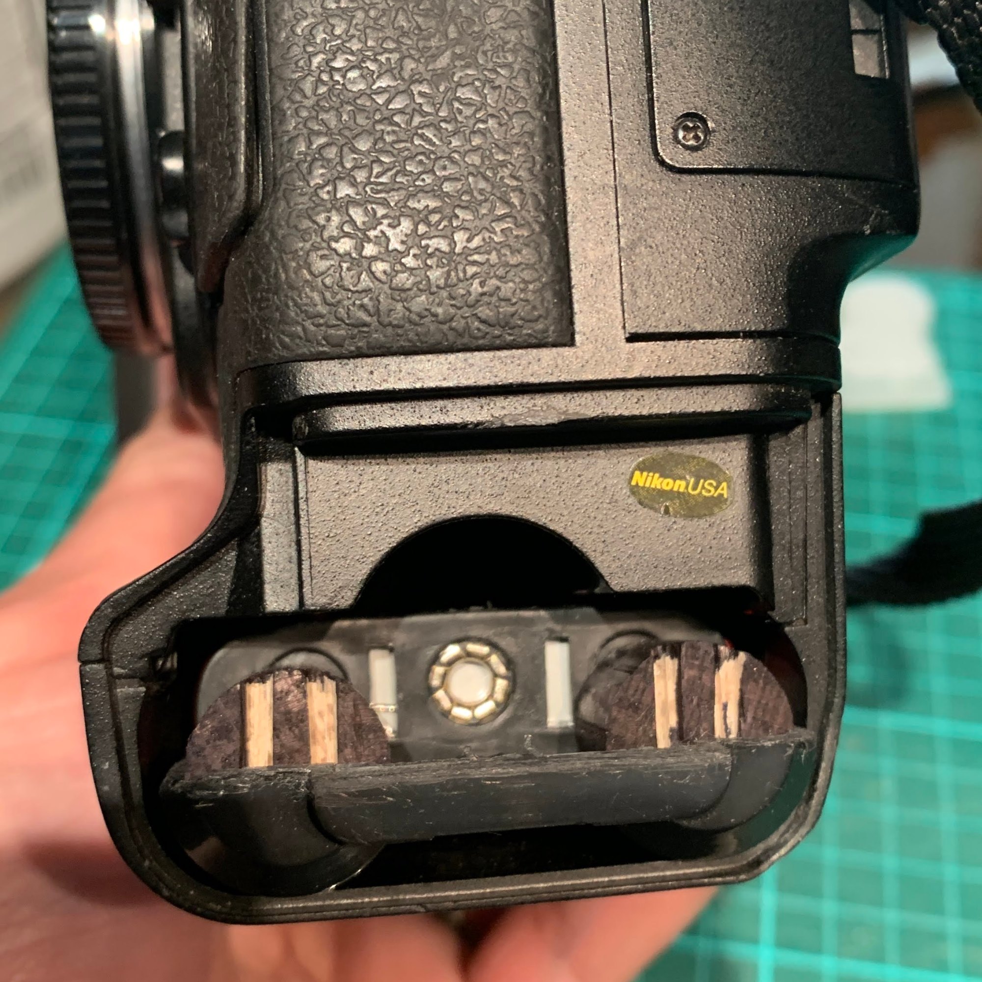 Before the metal lens mount ring could be detached, the lens contact points had to be released from the mount. This was held in place by 2 small screws. The lens contact points are connected to the lens CPU by a cable, hence the contact points have to be detached before I could remove the lens mount ring completely.