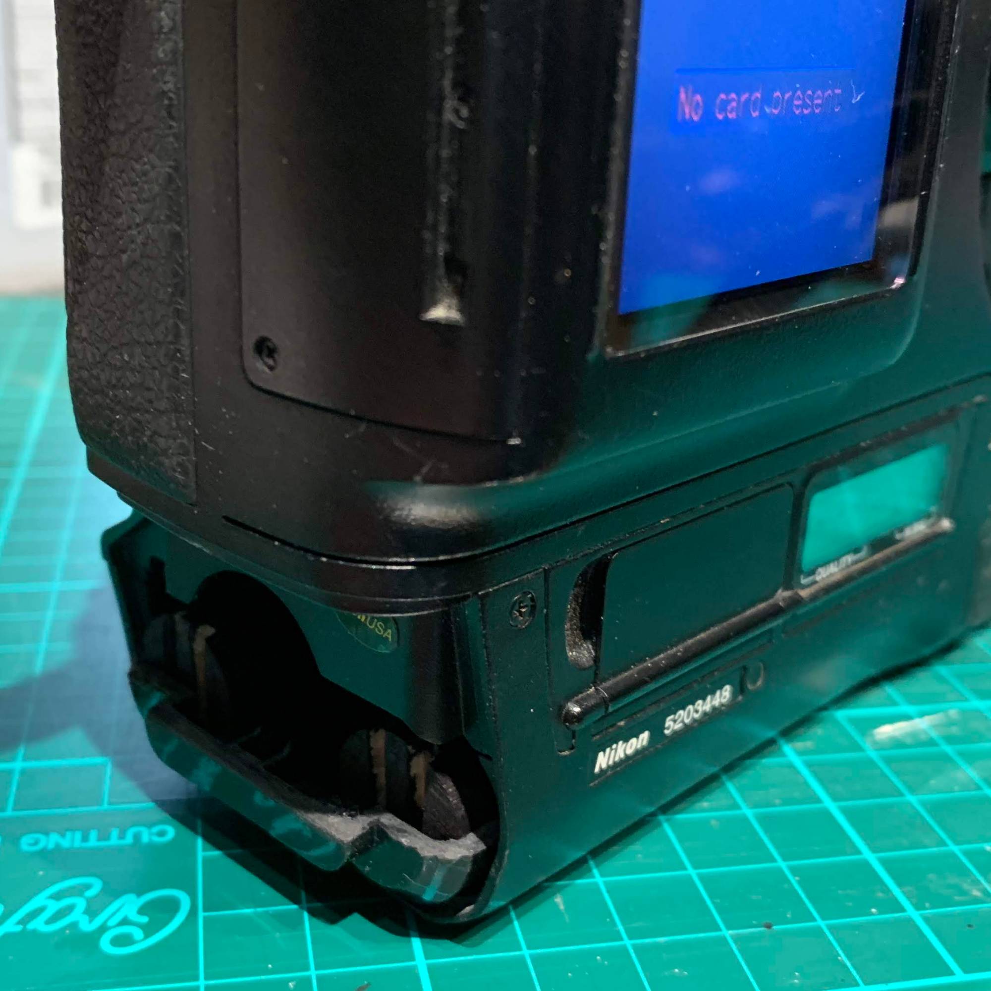 Puzzled, I examined the barrel closer with my loupe. Sad to say, I noticed a crack in the plastic gear that moves the brass auto-focusing contacts. In fact the crack was more extensive, extending diagonally from the base of the focusing ring to the base of the lens mount. What!